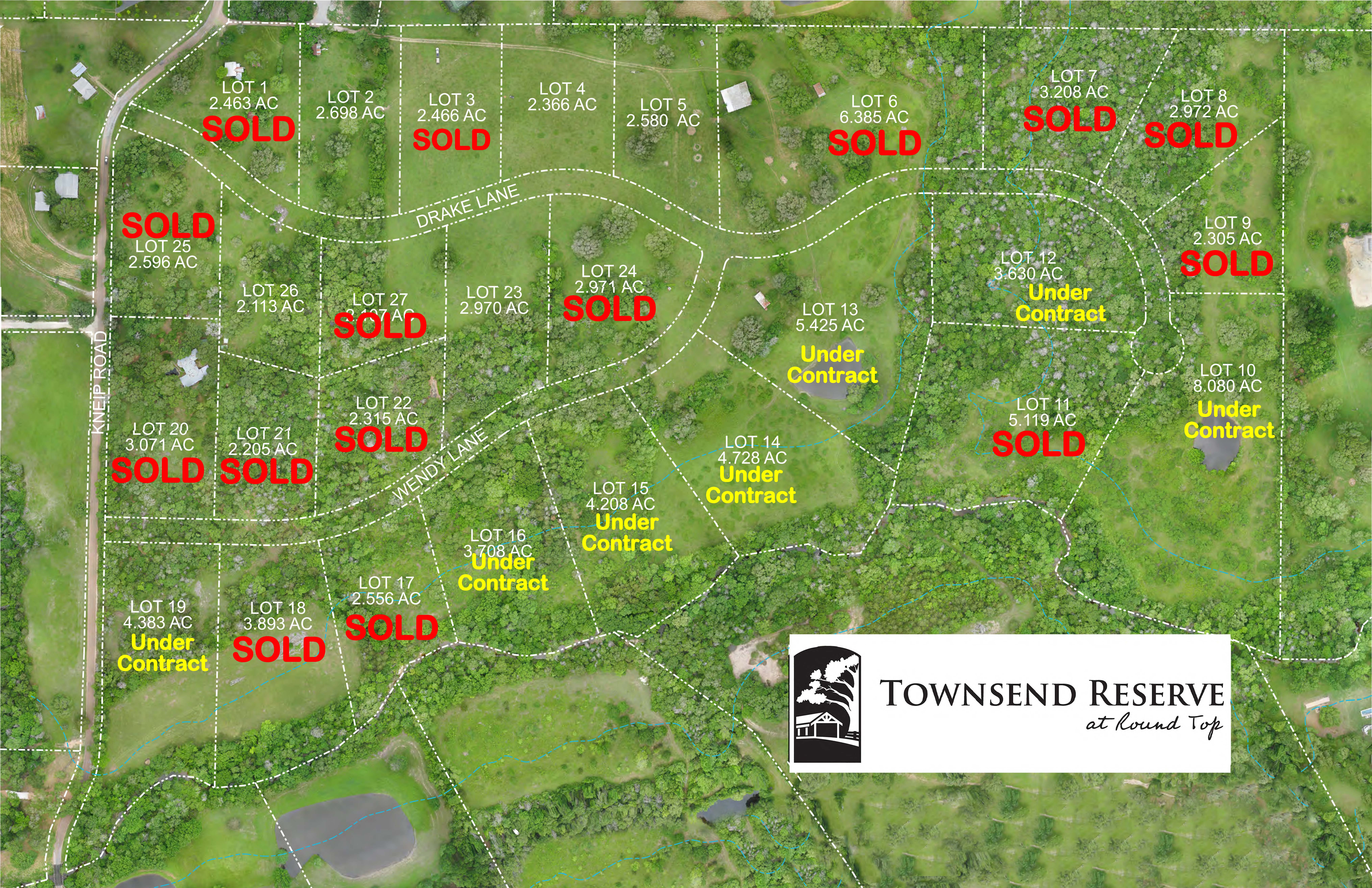 Townsend Reserve is only half a mile from upscale boutiques and cozy eateries. This stunning development features majestic oak trees, rolling hills, and serene natural creeks, all spread across 100 acres. With 27 homesites available, you're sure to discover the perfect spot to call home. Townsend Reserve is just moments away from the vibrant Round Top square. Plus, a wildlife valuation is in progress to help keep your taxes manageable. Exciting amenities on the horizon include a charming covered bridge, split rail fencing, underground electricity, and fiber optic connectivity!