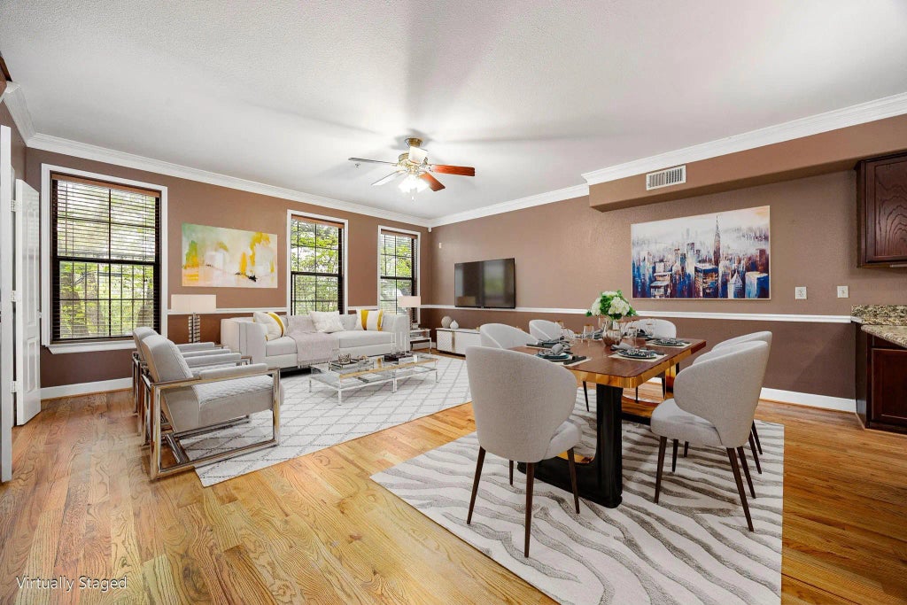 Prime Midtown Condo with Stunning Downtown Skyline Views! This 2-bedroom, 1.5-bathroom condo offers the perfect blend of modern convenience and stylish living in one of the city's most sought-after locations. The open floor plan features a spacious first floor with a bright dining area, inviting living room, and a chef’s kitchen complete with a central island and granite countertops. On the second floor, you’ll find the primary bedroom, which includes a cozy sitting/office area, and a full bath with double sinks and granite countertops. The third floor provides a versatile second bedroom or flex room with a generous walk-in closet. This home boasts beautiful crown molding on the first and second floors, with a chair rail adding an extra touch of charm on the first floor. Controlled access security gate. 2 assigned parking spots side by side. Private courtyard. Across from Baldwin Park. Don’t miss the opportunity to live in the heart of Midtown with views of the downtown skyline!