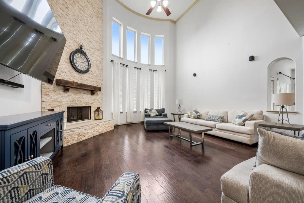 Welcome to this pristine home in sought-after Stone Creek Ranch. Boasting a rare four-car garage, this residence combines luxury, functionality, and thoughtful design throughout. Step inside to find wood flooring in the formal dining room, private study, and spacious den. The den features a dramatic floor-to-ceiling ledgestone fireplace with a custom wood mantle creating a cozy and elegant focal point. The chef’s kitchen is equipped with an island, granite countertops, stainless steel appliances, Whirlpool dishwasher, and convenient cabinet pull-outs for optimal storage. Retreat to the expansive primary suite with a luxurious en-suite bathroom, featuring dual granite vanities, a frameless glass shower, and a jetted soaking tub. Upstairs, enjoy a large game room complete with a granite bar and a newly installed backsplash, plus three generously sized bedrooms. The backyard oasis includes a covered patio and ample space for perfect for outdoor entertaining or relaxing.