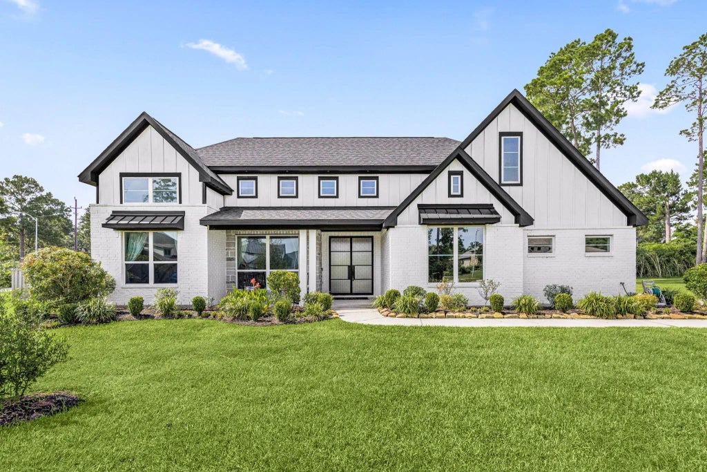 Former Dunn & Stone Model in Mostyn Manor Reserve W/ NO MUD TAX & LOWER TAX RATE! Entry features a custom stone curved ceiling w/ chandelier leading to an airy layout w/ soaring ceilings. Two front bedrooms have dramatic 2-story ceilings, one w/ sliding barn door ideal for office or flex space. Living area boasts a wall of glass windows overlooking the backyard & covered patio w/ gas hookup & outdoor TV mount for true indoor/outdoor living. Modern farmhouse details include tall doors, designer fixtures, gray walls & gray hardwood-look vinyl plank in main areas plus a mudroom. Chef’s kitchen offers quartz counters, oversized island, pendant lighting & walk-in pantry. Primary suite has tray ceiling, dual closets, soaking tub & seated shower. Upgrades: $23K 7-ft Texas Fence (2020), tankless water heater (2021), new disposal (2025), sprinkler repairs (2025), dedicated circuit for fitness equipment. Extras: abundant storage, lofted attic, 3-car garage. Near new H-E-B & Magnolia Place shops.