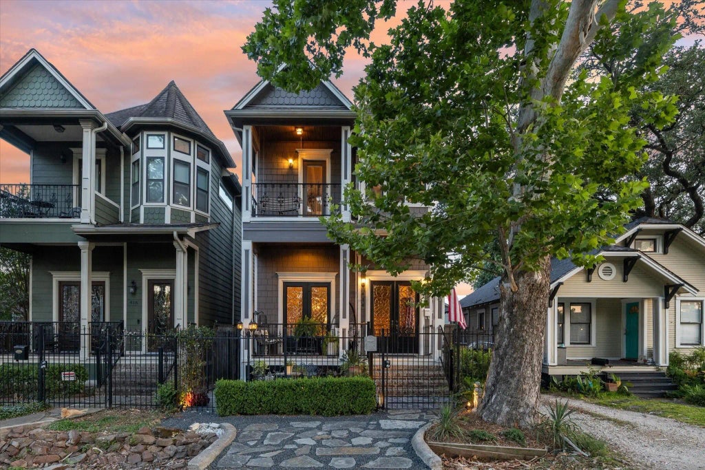 Beautifully maintained charmer in Sunset Heights. A welcoming front porch invites you into elegant formal living and dining areas. Updated kitchen features an island with bar seating, ample storage, gas range, and opens to the spacious family room, which overlooks the back patio. Family room offers both comfort and style, a gaslog fireplace framed by illuminated built-in shelves. Serene back deck complete with bed swing, room for a dining table, and additional seating space—perfect for outdoor entertaining. Sweeping staircase leads to the second floor's three bedrooms, including impressive primary suite with private balcony, luxurious en suite bath, jetted tub, glass shower, and two expansive walk-in closets. Two additional bedrooms share a Hollywood bath, and a conveniently located utility room completes the upstairs layout. Detached garage includes unfinished guest suite or flex space. Unbeatable location with quick access to 610, 45, I-10, and all the Heights has to offer!
