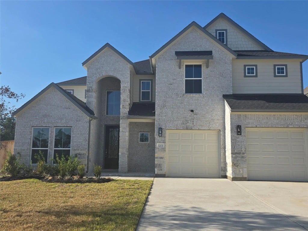 NEW CONSTRUCTION - Long Lake Plan 660, Briarwood Series - Welcome home to 3203 Bushy Hawthorne Drive, located in the beautiful community of Barton Creek Ranch and zoned to Conroe ISD. This stunning 2-story, 4-sided brick home sits on an oversized lot with no rear neighbors and offers 5 bedrooms, 4 full baths, 1 half bath, and a 3-car tandem garage. Inside, you’ll find elegant features such as wood-look tile flooring throughout the common areas, a study with French doors, stainless steel appliances, under-cabinet lighting in the kitchen, and stylish metal balusters on the staircase. The spacious primary suite and additional bedrooms provide comfort for the whole family. Step outside to an oversized rear patio with gas stub, perfect for entertaining. The home is complete with black exterior coach lights, 2" faux wood blinds, and full gutters for added convenience. Extra 2 ft. additional driveway, wood entry floors, wood great room, wood dining room, wood primary bedroom.