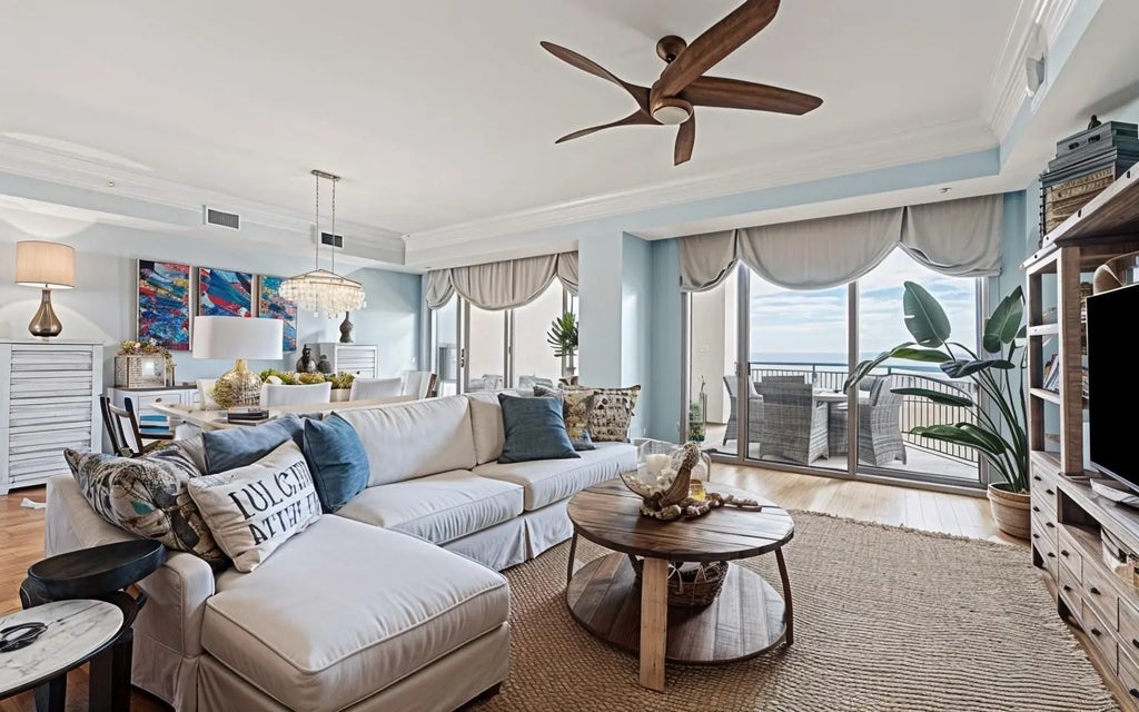 Experience breathtaking vistas from three balconies overlooking the sandy beaches and the mesmerizing ocean waves to the south and west, along with panoramic views of the Bay and Wetlands! This Signature Newport floor plan boasts 10' ceilings adding a sense of spaciousness and luxury. Many custom features including recent paint, recent ACs and water heater, recent countertops, built-ins, unique lighting fixtures and exquisite bamboo flooring. Luxurious Primary Suite offers a private balcony, large walk-in closet and an en suite bath. Two ample additional bedrooms with fantastic views plus two additional baths make this a perfect fit for your family and guests. Beachside balcony has plenty of space for dining and relaxing and includes a built-in stainless steel grill! Purchase today and enjoy the beach resort lifestyle with the ones you love!