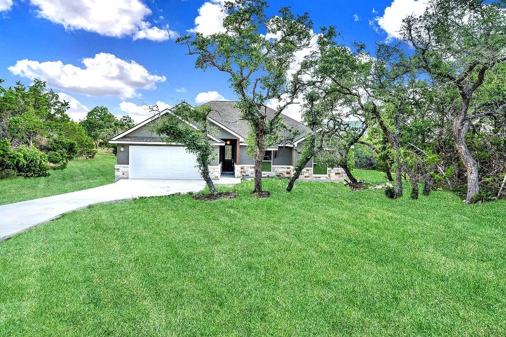 Welcome to your dream home in the heart of the TX Hill Country.This home has all the custom finishes & the charm of country living-all within minutes of Canyon Lake, Wimberly & New Braunfels.Vaulted ceilings, wood beams & Hill Country finishes throughout.Energy efficient windows & open-concept floor plan. This 1.1 acre property has plenty of room for a work shop, pool, guest house etc.Part of the lot is wooded for privacy.This home has neutral to any decorating styles.Custom wood cabinets, quartz countertops throughout, marble backsplash in kitchen, custom kitchen island with room for wine storage & your cookbooks.Primary bath has dual sinks, soaking tub & separate walk in shower with upgraded high end tile.Laminated flooring throughout.Stacked rock wood burning fireplace. Extra large garage with room to park large vehicles & have storage space.This home has NO City taxes.This home is ideal for family living, short term rental.Now is your time to move to the Hill Country!