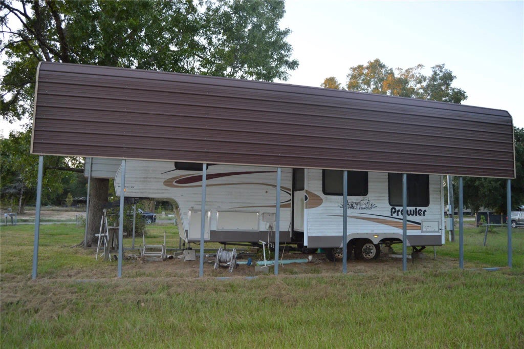 over 1/3 acre fenced lot with hook-ups for multiple rv's - current 5th wheel is staying - per seller it is a 2002 28 ft Prowler - multiple storage buildings & large, anchored metal awning to protect camper - field-line septic - per seller, if brush is cleared, there is a water view