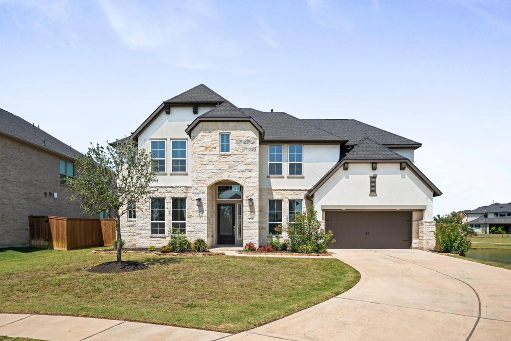 Situated on a premium lakeview lot in a gated community, this home offers stunning water views from two sides. The open floorplan features a study off the entry, formal dining, and a gourmet kitchen with oversized island, pot filler, gas cooktop, and double ovens—all open to the family and breakfast rooms overlooking the lake. A second bedroom down includes an ensuite bath and walk-in closet. The primary retreat boasts lake views, a sitting area, spa-like bath with soaking tub, large shower, and expansive closet. Upstairs offers two bedrooms with walk-in closets and separate vanities, plus a shared wet area, game room, media room, storage room, and decked attic. Relax on the covered patio overlooking the lake, and enjoy the convenience of a spacious three-car garage. Energy-efficient radiant barrier roof. Community amenities include pool, gym, playground, and sports park. This lakeview gem is a must see! Enjoy the rare benefit of a low 1.78% tax rate and No MUD tax.pot filler, gas