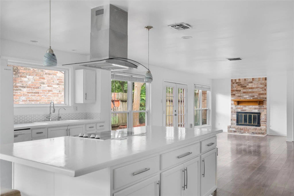 This charming 3-bedroom, 2-bathroom gem is filled with natural light, thanks to its large windows and open-concept layout. The updated kitchen features sleek white cabinetry, modern backsplash, and a spacious island perfect for entertaining or casual family meals. You'll love the brick fireplace in the living room that adds a warm, cozy touch. With fresh finishes throughout, including updated flooring, paint, and fixtures, this home blends modern comfort with timeless charm. Nestled in a quiet, well-kept neighborhood, it's the perfect retreat while still being close to everything you need. Don't miss this light-filled haven — it’s move-in ready and waiting for you!