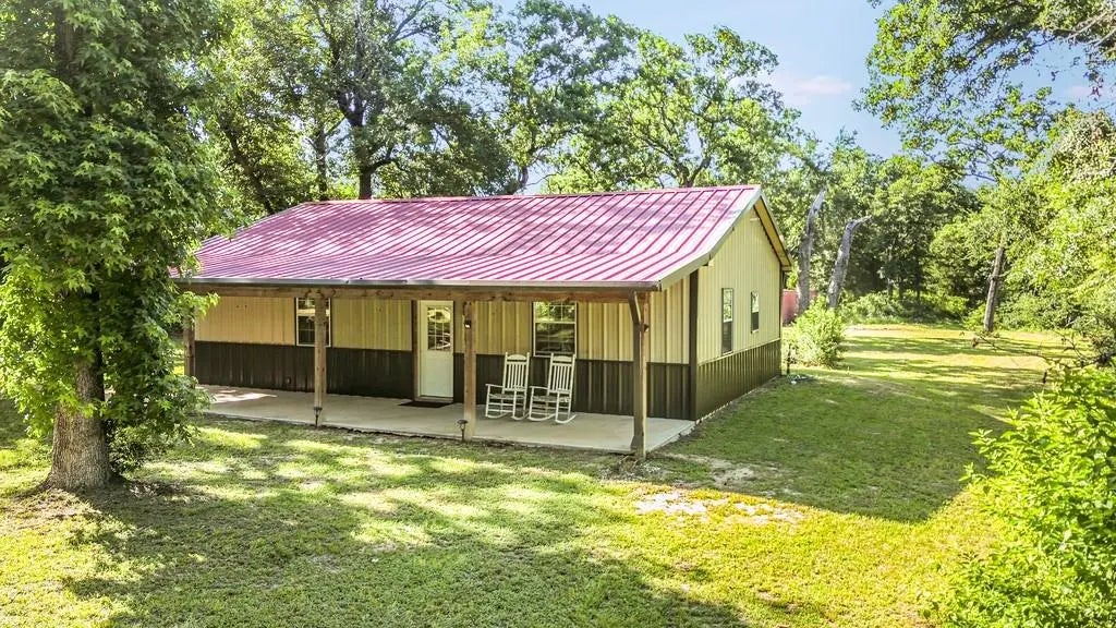 Escape to your beautifully wooded 50ac property with a fully metal, fully furnished 2 Bed 2 Bath Barndominium built in 2019. Home has 100% 6-8 inch thick closed-cell spray foam insulation (it's a Yeti). The CONEX box, 7 feeders, 4 deer blinds, carport, storage shed, and all furniture and appliances seen in photos will convey (excluding black freezer by W/D). With dual queen-over-queen bunk beds and fold out couch this cabin sleeps 10 easy. PEX throughout and 3/4 finished attic decking. Additional 50-Amp RV connection with septic. 1000 gallon septic pumped Mar 2025, A/C serviced Apr 2025. Multiple veterans and former law enforcement living in neighborhood, so it is a well protected area, zero shenanigans.