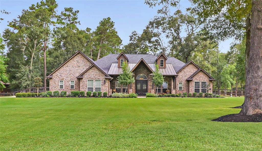 Stunning Custom Home on 2.56 Acres in The Cliffs at The Commons of Lake Houston. Located in the gated, private section of the neighborhood, this beautifully designed 3-bedroom home with an additional office (optional 4th bedroom) offers the perfect blend of elegance, comfort, and functionality. The spacious family room features an indoor gas fireplace, while the integrated audio system enhances both daily living and entertaining. The gourmet kitchen opens seamlessly to the living space, and the primary suite boasts a restful escape and ensuite complete with a luxurious walkthrough shower, dual vanities, separate closets, and jetted tub. Step outside to enjoy a fenced backyard, outdoor wood-burning fireplace, and the peace of 2.56 serene acres boasting mature trees and room to accommodate your outdoor living dreams. A 4-year-old roof adds extra peace of mind for years to come.