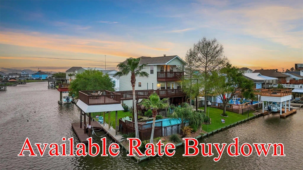 Available interest rate BUYdown so the buyer can geta lower rate with this home. Contact agent for details. *IT’S ALL ABOUT THE WATERFRONT VIEWS* Nestled at the corner of 2 serene canals & blending upgrades w/coastal charm, this costal home promises a lifestyle of relaxation. Ready for your enjoyment w/breathtaking views from the pool, covered patio, or upper deck of the boathouse. Outdoor features boating, kayaking, & fishing right from your dock. Extra wide staircase greets you as you step inside to discover Luxury Vinyl cork-backed floors throughout the main living areas. Open-concept design features shiplap accents, high ceilings, & a coastal-theme throughout, creating a breezy/inviting atmosphere. The heart of the home is the well-appointed kitchen w/ an updated stove, built-in wine cooler & island for entertaining. PLUS 2 new HVAC systems, new roof & solar panels. Lush landscaping attract butterflies & birds. Extra parking. Just a boat ride away to West Bay & Galveston Island!