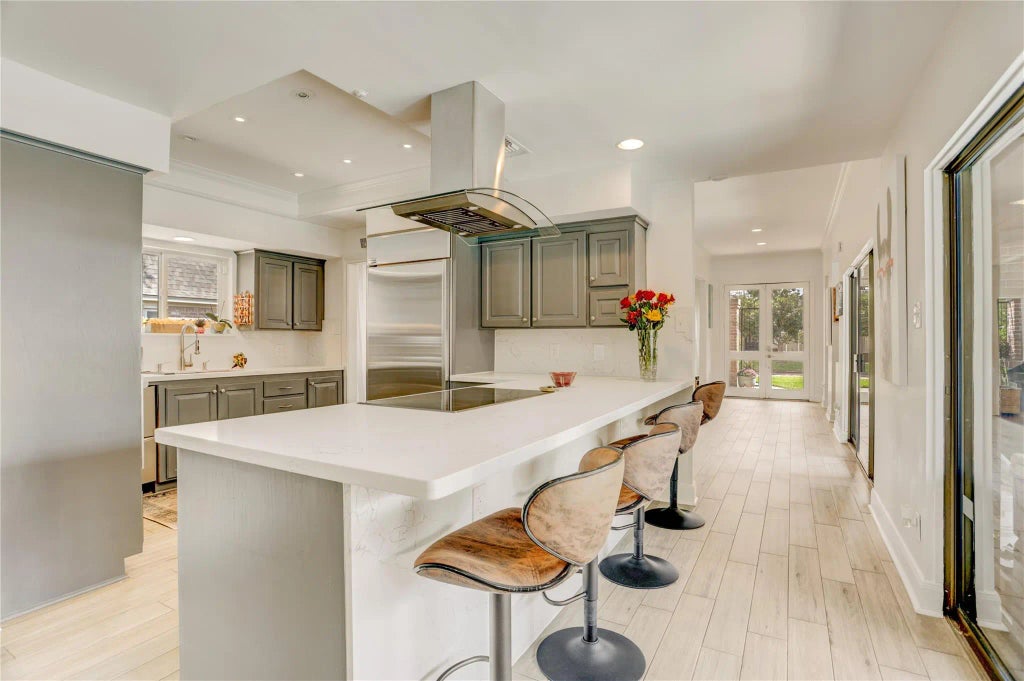 Phenomenally updated 1 story with pool in Energy Corridor neighborhood with 24-hour constable, pool, tennis, pickleball, basketball, playground and clubhouse. Two large living areas - both with fireplaces. Kitchen has quartz counters and SS GE Monogram built in refrigerator. Hardwoods in LR + primary BR, ceramic tile in other living areas and baths, carpet in 2 bedrooms. Sliding doors to pool from primary bedroom, and living areas. Home automation features & cameras. HVAC 2021. Tankless water heater. Roof 2018 & gutters 2022. Whole house generator and Tesla charger are not included, but are negotiable.