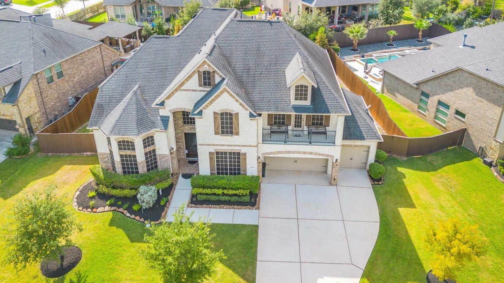 ONE OF A KIND, Very Unique 5-BRS,4.5 baths, 4-CAR GARAGE with AC & epoxy floors, full size truck can fit easily, (MAN CAVE GARAGE). The primary BR and a guest BR down, both with ensuite baths. The primary bath has 2 walk-in closets, oversized sep shower w/bench. Gorgeous Kit, w/dbl ovens, curved island and serving bar, stainless appliances and Persa granite counters, white glazed cabinets and lighted upper cabinets, all open to a 2-story family room with 19' stone fireplace. Large fml dining, breakfast room, butlers pantry, built-in wine fridge, custom lighting throughout home, and a large study w/glass French doors & ceiling beams. Upstairs has a large game room with direct access to the front balcony looking out to the neighborhood lake and greenbelt., extended media room w/awesome sound and platform seating, 3-more secondary BRs and 2 more bathrooms. Total private bkyard with 8' fence and enhanced tall landscaping with plenty room for a pool. Located in the high rated Tomball ISD