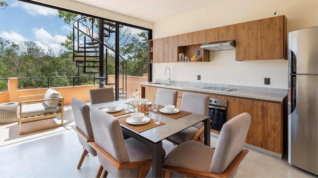 Welcome to the Chaca Floorplan, a stunning two-bedroom, two-bathroom residence offering approximately 850 square feet of living, air-conditioned luxury in the heart of Tulum. This elegant floor plan is designed for comfort and functionality, perfect for both investment and personal living. Chaca features: Private rooftop terrace — perfect for enjoying Tulum’s sunsets, Private garden area for relaxation, Two parking spaces included, Convenient laundry room, Air-conditioned interiors. Exclusive amenities include: Infinity rooftop pool with breathtaking views, Ground-level pool, Co-working area with Wi-Fi, Kids’ play area, Hammock zone, Picnic and grilling area Located just minutes from the beach, Aldea Savia blends modern luxury with Tulum’s natural beauty, offering the perfect balance of tranquility and vibrant living.