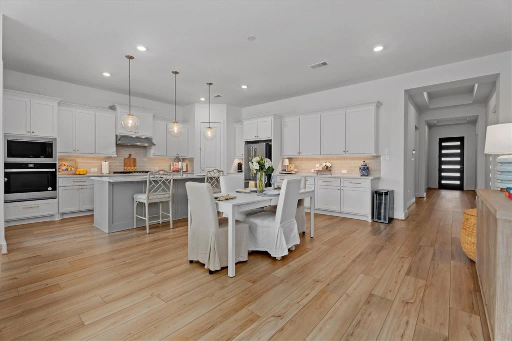 Stunning 1 story brick home that has been meticulously maintained residence features 4 beds, 3 full baths, and a dedicated home office. Elegant high tray ceilings and Shaw Polaris Plus Driftwood luxury vinyl plank flooring flow seamlessly throughout the home. Kitchen is a delight with a gas cooktop, stainless steel appliances, quartz countertops, and Rejuvenation hardware, which is also featured in all 3 baths. Open concept design connects the kitchen to the dining area and living room, where large windows fill the space with natural light. Spacious primary suite has a spa like ensuite with double sinks, soaking tub, separate shower, and a walk in closet. Curtain hardware and curtains (excluding the office) remain with the home, along with the refrigerator and dryer. Step outside to a covered patio pre plumbed for gas and water, perfect for outdoor entertaining. Enjoy Sienna’s exceptional amenities, including pools, scenic trails, playgrounds, volleyball courts, and more.