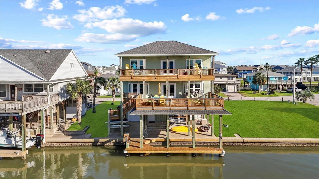 Canal-front home in Terramar Beach offering stunning sunset views and a lifestyle you'll love. This well-maintained coastal retreat offers 4 bedrooms, 2.5 baths, and 2,155 sq ft of thoughtfully designed living space. The spacious primary suite is located on the main floor and features a walk-in shower, built-in bench, and a custom walk-in closet. Enjoy open-concept living with premium shiplap walls, wood-look porcelain tile floors, and a modern kitchen with quartz countertops, an island, and double ovens. Upstairs, you’ll find a versatile game/media room that opens to the deck, a 6-bed built-in bunk room, and guest bedrooms all with water views. The outdoor living is just as impressive: multiple decks with bay and canal views, an enclosed tiki bar with a half bath on the ground level, and a private boat house. *Additional lot with sprinkler system available separately.* Whether you're looking for a primary, second home, or investment—this one is a memory maker!