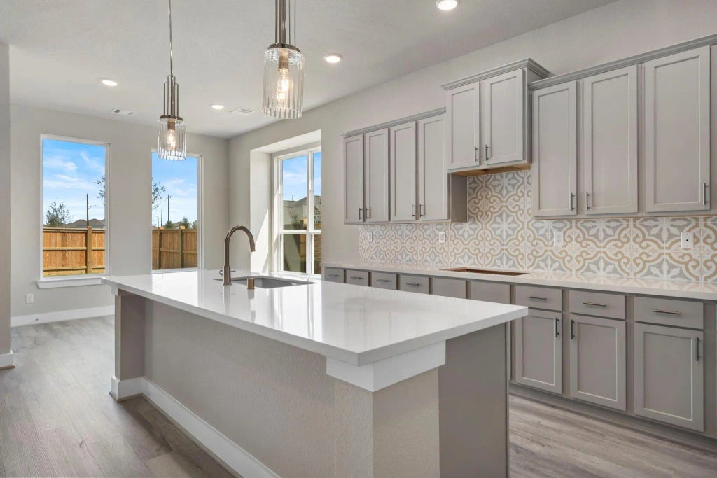 Welcome to this beautifully crafted Cypress II plan by HistoryMaker Homes, located on a corner lot in the master-planned community of Katy Lakes. This two-story boasts an open-concept design with 10-foot ceilings downstairs, a vaulted 20-foot ceiling in the living room, & modern touches throughout. Enjoy a chef-inspired kitchen with built-in stainless appliances & luxury vinyl plank flooring that flows through the kitchen, living, nook, & home office with French doors. The downstairs primary suite is a true retreat, featuring a garden tub, separate shower, & double vanity. Upstairs offers a spacious game room, three well-appointed secondary bedrooms, & two bathrooms, one of which has convenient joint access to two of the bedrooms. Step outside to your extended covered patio, complete with an exterior gas line for a future outdoor kitchen, perfect for entertaining. Full gutters, sod, & irrigation included. On a 55'x123' corner homesite, this home combines comfort, style, & smart design.