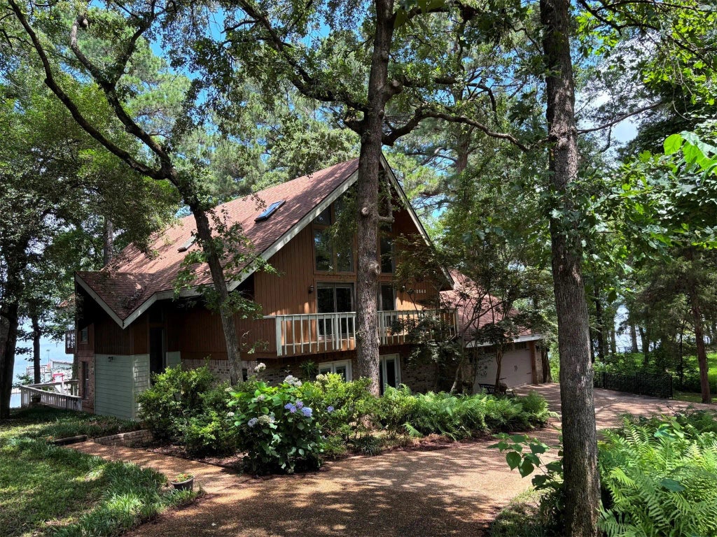 This quintessential Lake Palestine home sits on three waterfront lots,1 acre in the desirable Hide-A-Way Bay neighborhood, with lush landscaping and excellent water. The great room features a breathtaking lakeview and French doors opening to a full-length deck for outdoor living. A cozy woodburning fireplace adds warmth on winter nights. The vaulted ceiling dining room is surrounded by windows,bringing the outside in. The kitchen also has lake views, Italian ceramic tile, and a Texas shaped wetbar Downstairs are two airy bedrooms with full baths and French doors to the garden. The wide staircase with skylight and vaulted ceiling leads to a game room with wood floors, beamed ceiling,wall of windows, built-ins, and a balcony. The primary suite has a fireplace,private balcony with lake views, and a luxurious bath with double sinks, whirlpool tub, skylight, and large shower. The boathouse includes an enclosed lift,covered and open decks, and an upper space ideal for sunsets and stargazing.