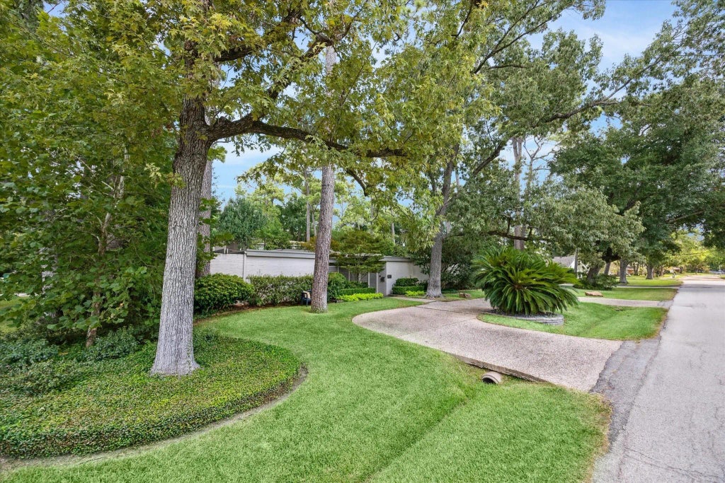 Architecturally stunning mid-century modern home by William Hoff on a spacious 16,300 sq ft lot. High ceilings, expansive windows, and lush views create seamless indoor-outdoor living. Thoughtfully maintained and updated with large rooms, refreshed baths, and a den/media room with wet bar. Professionally landscaped backyard features custom lighting by Illuminations, moonlit treetops, glowing flower beds, and a sparkling pool surrounded by mature trees. Conveniently located near I-10, Beltway 8, and Memorial-area shopping/dining. Zoned to top-rated Frostwood Elementary, Memorial Middle, Memorial High. Per seller, home has never flooded. A true gem of iconic design, comfort, and location—offering potential for renovation or new construction in a sought-after neighborhood surrounded by new builds.