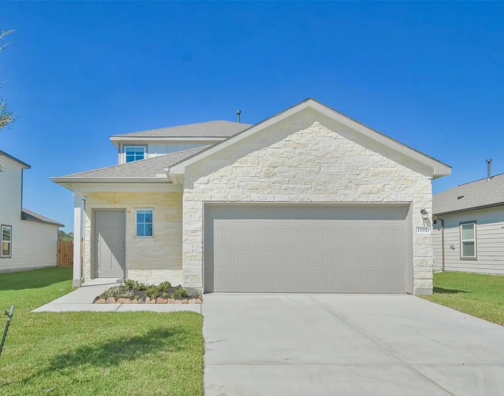 Welcome to The Sabine, a stunning two-story home nestled in the desirable Villages at WestPointe community. This 4-bd, 3-bath home offers 2,128 sq ft of thoughtfully designed space. Main floor boasts an open concept living & kitchen area, perfect for entertaining, alongside the convenient guest room & bathroom. Owner's suite features a spacious closet & dual sinks in the ensuite bath, ensuring comfort and luxury. Upstairs, find two additional bedrooms, a 3rd bathroom, a versatile loft, & a study/flex space that adapts to your lifestyle. Upgrades include granite countertops, elegant ash cabinets, and ceramic tile flooring. A covered patio, blinds, & a mud bench enhance functionality, a tankless water heater, fully sodded yard, and irrigation system add efficiency. The refrigerator, washer, & dryer are included for your convenience. Community offers amenities such as two dog parks, playground, basketball, and volleyball courts. Dayton ISD!