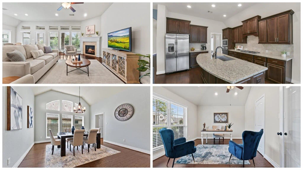 Beautifully crafted by Perry Homes, this one-story home offers a perfect blend of functionality, style and comfort. Featuring a private study and formal dining, the spacious 4 bedroom and 3.5 bath open-concept floor plan is enhanced by soaring ceilings and rich wood flooring. The gourmet kitchen boasts granite counters, stainless-steel appliances and an oversized island. Enjoy natural light streaming through expansive windows and unwind in the low-maintenance backyard with a large covered patio adorned in wood-look tile. Elegant curved arches, contemporary fixtures and neutral paint create a warm and inviting atmosphere throughout. Lovingly cared for and truly move-in ready, this home is perfect for your next chapter. Located in the sought-after community of The Groves, this home provides access to a lush, tranquil setting, while the community's imaginative amenities—pool, fitness center, community center, splash pad, nature play areas and more—offer something for every lifestyle.
