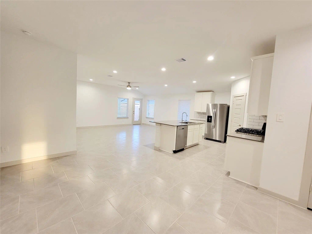 Moden, spacious one-story home has large, covered patio. Big back yard has full sprinkler system. Full gutter. Kitchen opens to family room. Split bedrooms. An open study and game room. Tile floor throughout. Carpet in bedrooms and study. Washer/dryer/refrigerator are included.