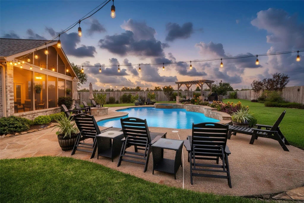 Welcome to this beautifully updated 4-bed, 2.5-bath home perfectly situated on a spacious pie-shaped lot with no rear neighbors. Inside, discover ceramic tile flooring, hardwood upstairs, & elegant spaces including a formal dining room, private study, & bright family room with a stone fireplace. The updated kitchen offers quartz countertops, cabinetry, herringbone backsplash, stainless steel appliances, & smart lighting. The first-floor primary suite offers vaulted ceilings, a spa-inspired bath with dual vanities, a soaking tub, a frameless shower, & a custom walk-in closet. Upstairs features a versatile game room, media room, & generous secondary bedrooms. Step outside to your private backyard paradise with a sparkling saltwater pool, raised spa, screened patio, pergola, & two firepits—all surrounded by lush landscaping. Smart home features include Nest thermostats, Ring cameras, smart garage doors, & a generator-ready hookup. Call today to schedule a private tour!