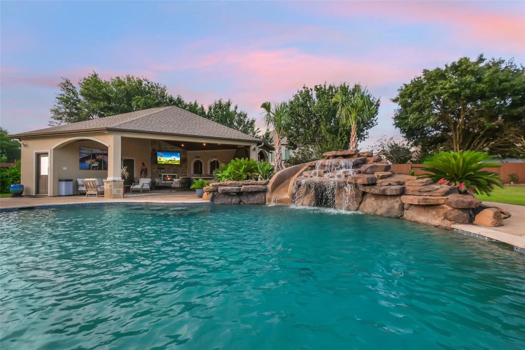 Stunning custom home located in an exclusive gated community. This fully renovated residence showcases exquisite features & designer touches throughout. Recent updates include new flooring, a completely remodeled kitchen, upgraded lighting & fixtures, & a fresh, curated color palette. An entertainer’s backyard featuring a sparkling pool and spa with a rock waterfall and slide, a covered outdoor pavilion w/ a full kitchen, beer tap, stone fireplace, enclosed storage, & a convenient half bath. And a 2nd covered patio w/ a grill just off the back door. Inside, the home boasts expansive open-concept living areas, a gourmet island kitchen, & a dramatic two-story great room with soaring cathedral ceilings and a striking fireplace. The formal dining room is enhanced by a built-in wine bar & a butler’s pantry, perfect for upscale entertaining. The executive office, media room, and game room are also enhanced & modern. The third bay of the garage is converted into a fully equipped home gym.
