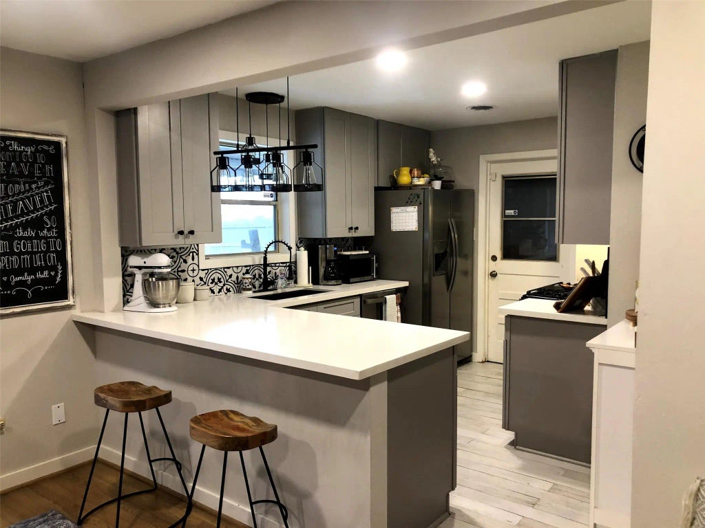 Remodeled with a Contemporary Flare~ This cozy house offers a defined yet open family room that cohesively connects to the breakfast area and kitchen emphasizing the functionality of the space. A Plethora of High End Finishes! Modern Kitchen with gorgeous white Quartz countertops contrasting with matte black gooseneck faucet and granite sink, chic grey cabinetry with elegant black hardware, stainless steel appliances and printed backsplash is sure to impress the classy tenant. White oak hardwood floors with silver grey stain aligns beautifully with the magazine worthy home. For showings, please text.