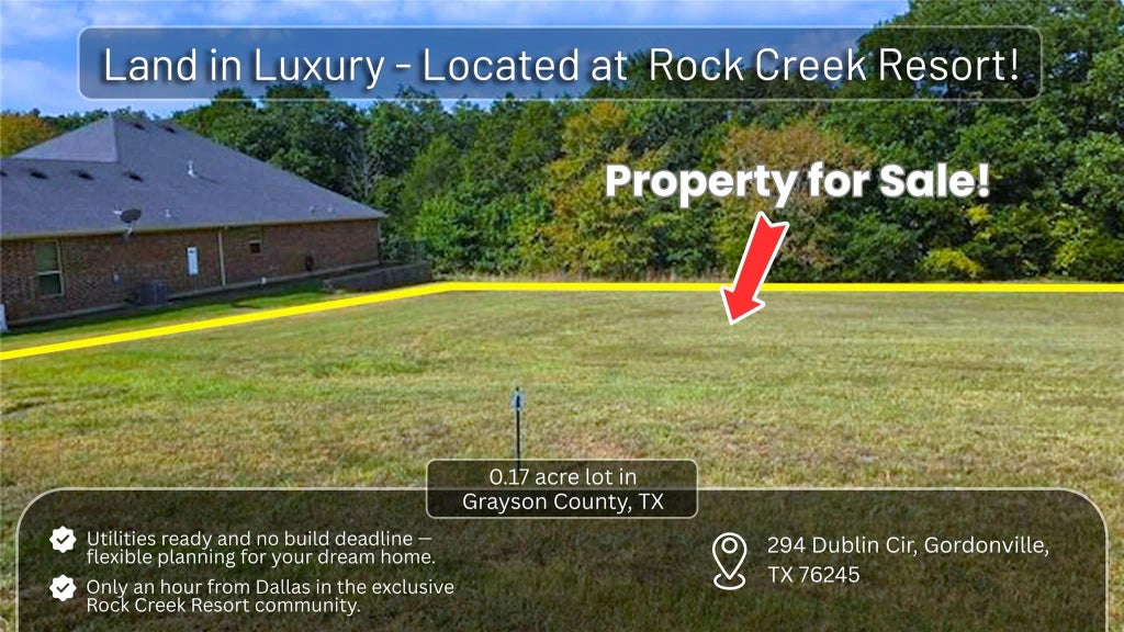 Beautiful 0.14-acre lot located in the Dublin Circle section of Muirfield Village at Rock Creek Resort on Lake Texoma! This premium homesite backs to a ranch with a creek separating it, providing natural privacy and a unique buffer from other properties. Rock Creek is a master-planned, gated community just one hour north of DFW, built around a Jack Nicklaus–designed championship golf course. Residents enjoy access to resort-style amenities: clubhouse with dining, marina with ship store, pool, spa, tennis, fitness center, trails, and more. Flat, buildable lot with utilities available and no time limit to build. Perfect for a full-time home, weekend retreat, or investment.