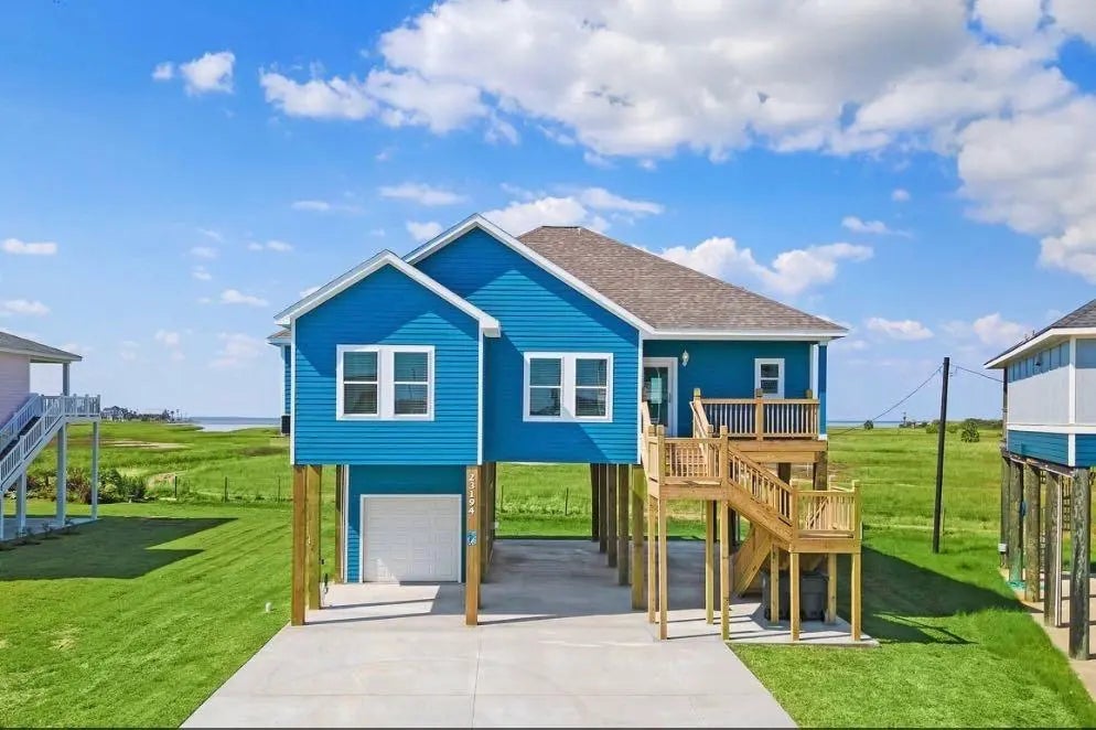 Experience coastal living at it's finest! This beautiful Galveston getaway home located in Terramar is ready for you to make it yours! The Kitchen is a chef's dream with a large island topped with Quartz counters, stainless steel appliances, custom inlay backsplash behind the range, shaker style cabinets with 3rd row for extra storage and elegance. Butler's Pantry with beverage/wine fridge and sliding pocket door. A wall of windows makes the open floor plan perfect for entertaining. Primary retreat with door to back deck. Luxury vinyl plank floors throughout. Enjoy your unobstructed bay views and sunsets from your own private extended covered deck. Exterior features include a cargo lift, outdoor shower, fenced in dog run, roll up pass thru bar topped with Quartz counters and hurricane rated windows and doors. Terramar Beach amenities include a pool, boat launch, fishing pier, pavillion, frisbee golf and beach access. This home is turn key and comes fully furnished! What an opportunity!
