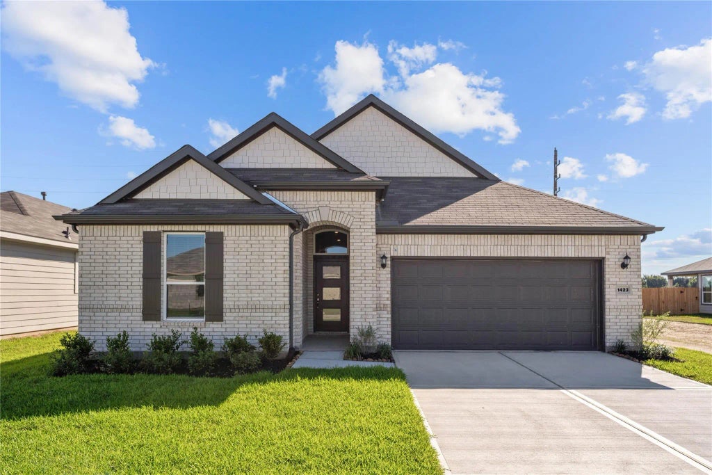 KB HOME NEW CONSTRUCTION – Welcome to 1423 Grand Olympia Drive, located in the beautiful community of Olympia Falls and zoned to Fort Bend ISD! This stunning 2-story home offers 4 bedrooms, 3 full baths, and an attached 2-car garage. The gourmet kitchen is designed with stainless steel Whirlpool appliances, Woodmont cabinets, a Silestone island, and a self-rimming single bowl sink. In the primary suite, enjoy a spacious walk-in shower with seat, dual sinks, and a wood-framed vanity mirror. The secondary bathroom includes a vanity with knee space for added convenience. Additional features include 2" faux wood blinds throughout, a Black Fox modern entry door with SmartKey hardware, black exterior coach lights, double flood lights with motion detector on the back porch, full gutters, and an extended covered patio—perfect for outdoor entertaining. This home WILL BE SOLD WITH ALL STAGED FURNITURE—don’t miss your chance! Call today to schedule your private tour!