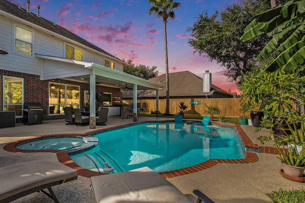 Welcome to 3228 Crimson Coast Drive! Make this your home and vacation away all-in-one! This home offers a perfect blend of comfort and entertainment - high-end finishes, open floor plan, game room down, and a backyard oasis complete with pool, hot tub and covered patio with wet bar! Recent updates include paint, windows, kitchen reno with island breakfast bar, rich stained cabinets and granite countertops, Master bath reno with new shower, granite countertops, cabinetry refaced, lighted mirrors, tiled accent wall, tile flooring, second bath ... LVP or tile throughout - NO CARPET! Both HVACs replaced in 2024. The pool is large enough to host volleyball, and the built-in hot-tub is perfect for everyday use. Luxurious tropical landscaping front and back. Whole-house Generac for power backup! Oversized gate access perfect for securing toys in your own backyard. This property is a true gem for those looking for a stylish and relaxing retreat. Book your appointment to view today!