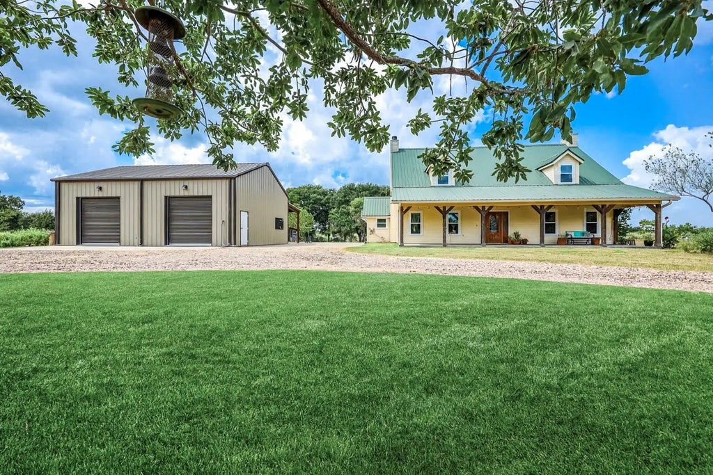 Welcome to your private retreat in the heart of the country. This charming home sits on 2 acres framed by mature shade trees, offering both privacy and wide-open space to enjoy. A classic green metal roof and inviting front and back porch set the tone for relaxed country living. Inside you’ll find soaring ceilings, warm wood accents, and thoughtful updates throughout. The spacious living room is anchored by a cozy fireplace and features exposed beams and abundant natural light. An open floor plan flows seamlessly into the dining area and kitchen, creating the perfect setting for both everyday living and entertaining. Step outside to enjoy the wide-open yard shaded by mature trees, perfect for play, animals, gardening, or simply relaxing in the fresh air. There is access to water in many key places in the backyard (5 total) With ample space inside and out, this property blends rustic charm with modern comfort, making it the perfect place to call home.