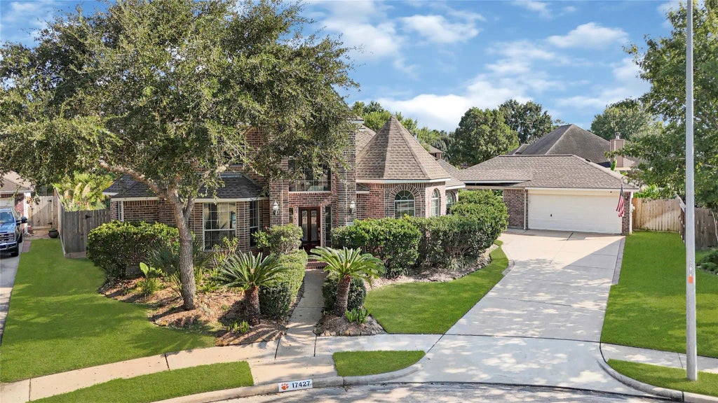 Nestled in the tranquil Copper Lakes community, this stunning two-story brick home on a culdesac features a lush tropical landscape including your own banana trees, saltwater pool, hot tub, and waterfall. Outdoor entertaining is a breeze with a grill, sink, fridge, and granite counters. Inside, the home boasts a remodeled kitchen and primary bathroom, custom closet cabinetry, soaring ceilings, Tile wood flooring, and neutral carpet and 2 new AC units. With 3 bedrooms, an office with a secret hidden closet, formal dining area, and modern fixtures throughout, this property offers a luxurious yet cozy living experience. Enjoy the quiet charm of Copper Lakes and recreational amenities nearby.