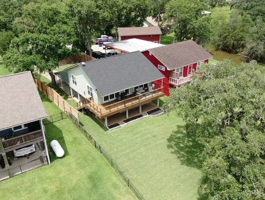 Welcome to the river! Nestled along the San Bernard river, this charming 3-bedroom, 2-bath home offers peaceful views and thoughtful design throughout. Tile and hardwood flooring flow seamlessly across both levels. The main-floor primary suite features a spacious walk-in closet with built-in storage and an ensuite bath with a relaxing tub/shower combo. Upstairs, two bedrooms share a convenient Jack & Jill bath with a shower-only setup. Enjoy river views and a breath of fresh air from the roomy space on the full-length balcony. The kitchen is both functional and inviting, with an island that encompasses the dishwasher, sink, and additional seating perfect for casual meals or entertaining. Additional highlights include built-in shelving throughout, a well-equipped laundry room with folding station and storage, a bright, open layout that brings the outdoors in and a new roof in 2024!. Perfect as a full-time residence or weekend escape.