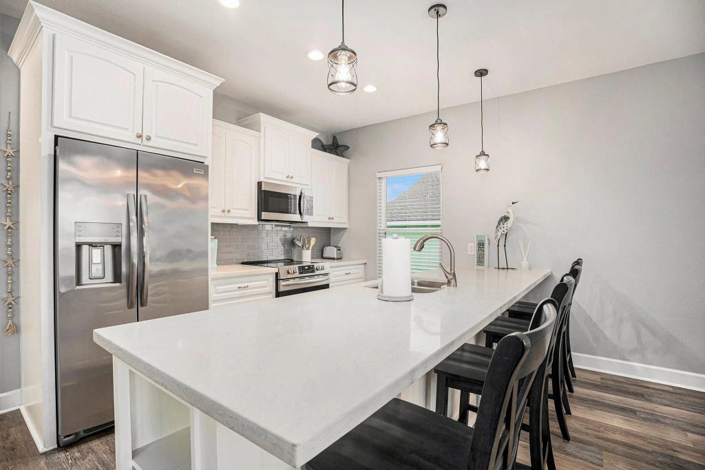 Like new, completely furnished coastal retreat in Emerald Beach located just a short stroll down the street to the sand and Gulf of Mexico. This inviting 3/2 comes totally turnkey and ready for your 2025 Summer enjoyment. Relax and enjoy a beautifully furnished home in high end coastal inspired decor inside and outside, featuring an oversized living area that is open to the kitchen, making for great entertaining and family gathering after a long day at the beach. The kitchen features beautiful, fresh white cabinets with quartz countertops and a stainless appliance package. Large primary ensuite with two additional guest bedrooms. Sit out and sip a cold drink on the 38x27 partially covered top deck or unwind downstairs on the ground floor, a perfect spot for outdoor games and cookouts. This home would make a great vacation rental, primary or second home. Owner has also installed a whole-home dehumidifier system. Come check this one out and see what Crystal Beach has to offer!!