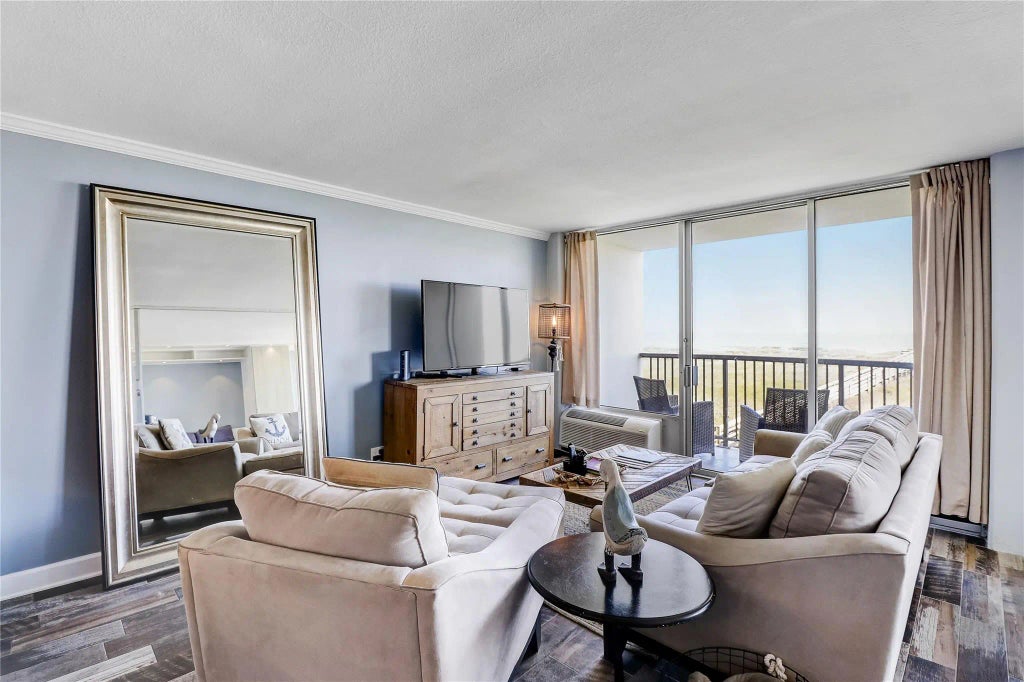 Beautifully decorated 2 bedroom condo ON THE BEACH with scenic views from every angle! One whole wall of windows and 2 balconies. Recently decorated in blues and beiges for that great beach feel! New wood-look tile throughout for an updated feel and easy cleaning. Modern kitchen with refrigerator and dishwasher, extended island for bar seating or gather around with friends and family. Exquisite bath with glass shower enclosure. Private bedroom with comfortable king bed. Second bedroom has a murphy bed to give you the option of extra living space OR close the gray accordion screen for another private bedroom. Owners may bring pets, dog park on site. Gated parking. This popular building allows Airbnb rentals and offers a workout room, pickleball/tennis/basketball courts, bacce ball, horseshoes, cornhole, gas grills, picnic tables in the fabulous breezeway, and a pool with waterfall. Easy walk over the sea grasses on the boardwalk to be toes on the beach! See Airbnb income in attachments!