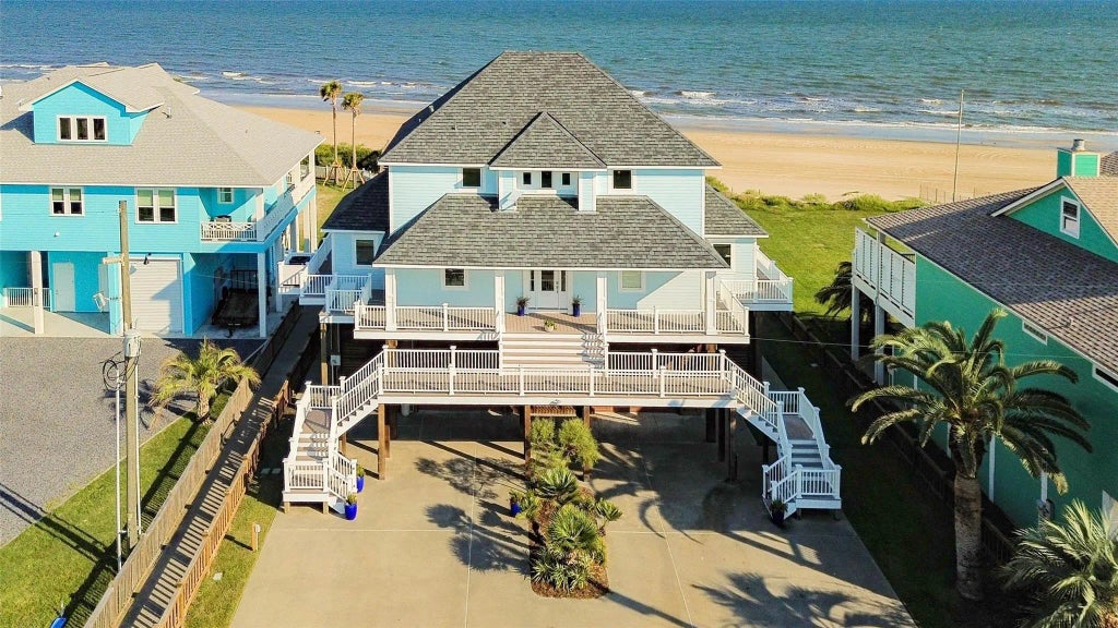 MAGNIFICENT beachfront home on Crystal Beach! Superior custom build has gleaming hardwoods, spectacular coffered ceilings & moldings, elevator, whole home GENERATOR, iron banisters, TREX decking and more! This top-tier property boasts an open floor plan with an expansive TREX deck, unparalleled OCEAN VIEWS! Dreamy kitchen w/ 6 burner stove, pot filler, huge island! Walk-in Butler's pantry, large utility room w/ storage, sink. Entertain in style with a ground level beachfront covered patio that includes an outdoor kitchen w/ a built in BBQ, cooktop, sink, a roll top bar area, outdoor shower, ground level full bath. An impressive garage to store beach gear. Luxurious primary suite has coffered ceilings, seating area, stunning views! Stunning primary bath has designer marble tile, lux fixtures! Top floor has a bunkroom w/ 6 built-in bunks and two more spacious bedrooms, two more beautiful full baths w/ dbl sinks, and a walk out balcony with ocean views! Must see this incredible property!
