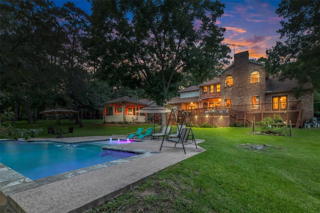 **New Price — $720,000** Now priced at $720K, this private estate in Willowridge Estates offers unmatched value. With 4,629?sq?ft, 4 bedrooms, 5 baths, and serene surroundings on over one acre, it’s an exceptional fit for growing families aiming to settle before school begins. Just minutes from I-45, with schools, dining, and shopping nearby. Enjoy peaceful surroundings and deer sightings in this expansive custom home blending country charm with modern comfort. In-ground pool, 3-car oversized garage, two carports, circular drive, and extra parking. The fenced backyard includes decking, a covered gazebo with hot tub, & an outdoor bathroom—perfect for entertaining. Inside offers wood floors, fireplace, French doors, wet bar, and a spacious island kitchen w/ granite, stainless appliances, cooktop, warming oven, butler’s bar, and bkfst area. The 1st floor primary suite includes an attached study, deck access, dual closets, and spa-style bath w/ soaking tub and walk-in shower.