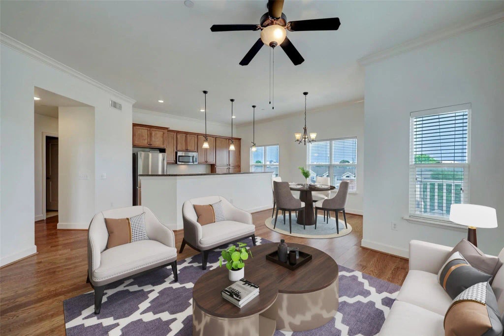 Location, Location, Location! Walk to the medical center, Rice University, Museum District, Rice Village, shops, parks, restaurants and more. Open concept living/kitchen area in this top floor until which is one of 44 units in the Sorento community. The natural lighting flows throughout the 10' ceilings and into the open and updated condo with stainless steel appliances with plenty of cabinets making the kitchen spacious. Primary suite features full bathroom and nice size walk-in closet. The 2nd bedroom has the hallway with built in desk, utility room and spacious bathroom. Wonderful patio with views of the medical center. This condo comes with 2 assigned parking spots 70&71 which are on the same floor and in a controlled/gated garage. Community includes a rooftop terrace to entertain and the on-site fitness center. Ready for move in!