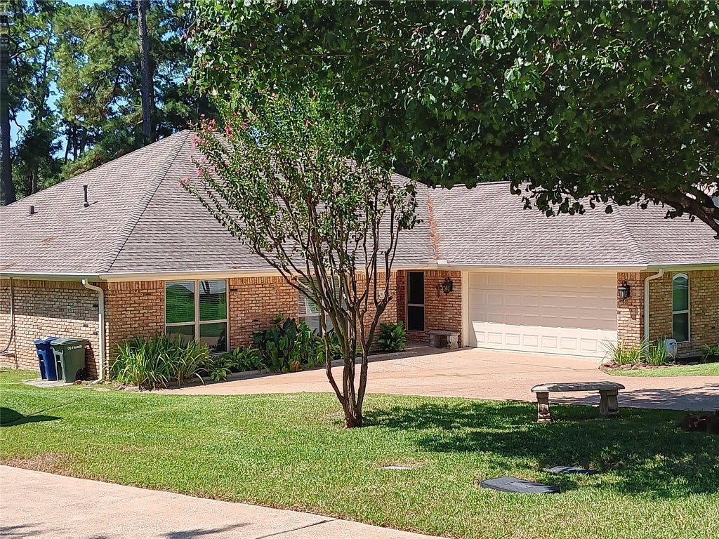 Recently updated 1 story brick home with 3 bedrooms, 2 bathrooms, study and oversized garage with golf cart garage located on Elkins Lake Golf Course.