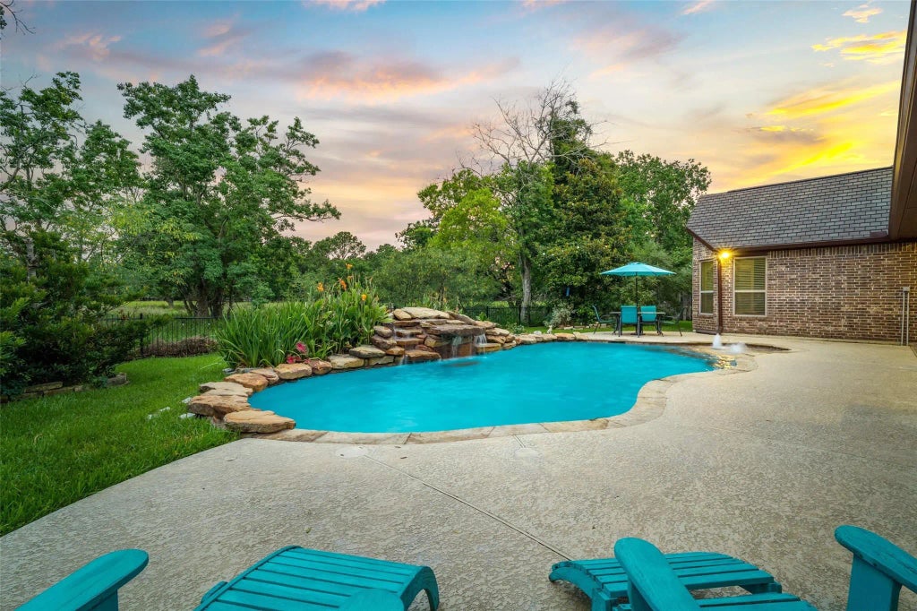 This custom-built ranch-style home sits on an oversized lot in Northfield Estates, tucked into the Forest of Friendswood with no back neighbors for added privacy. Designed with high ceilings throughout, this one-story layout blends comfort with upscale features. The grand entry opens to travertine tile floors, a private office w/ French doors, and formal dining. The chef’s kitchen offers a large island, tall cabinets, gas cook-top, and stainless appliances, flowing into a spacious living room w/stone fireplace, custom wine bar, & wall of windows framing serene backyard views. The primary suite features a sitting area, patio access, and en-suite bath w/ jetted tub, walk-in glass shower, dual vanities, and a spacious walk-in closet. A step-down theater room & 3 additional bedrooms complete the layout. The backyard offers a relaxing retreat with covered patio, built-in grill, pool w/ fountains, rock waterfall, & peaceful green space. Contact agent for additional listing information.