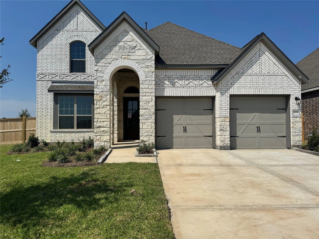 Designer kitchen featuring navy blue cabinetry with modern gold hardware! Experience modern living in the Tyler home plan, where elegance meets functionality across two thoughtfully designed stories. The grand entrance leads to a spacious family room that features soaring ceilings and an open view of the game room, perfect for family gatherings or entertaining friends. The gourmet kitchen, a culinary enthusiast's dream, boasts ample prep space and a generous walk-in pantry, ensuring convenience without sacrificing style. The primary bedroom serves as a serene retreat, highlighted by a extended sitting area and double door entry that leads into the luxurious primary bath, complete with separate vanities. This home features the Sapphire 2.0 Collection where the focal color demands attention to beautiful Navy-blue cabinets and modern gold hardware. Located in Katy lakes and offers a variety of amenities including walking trails, playground and a resort style pool.