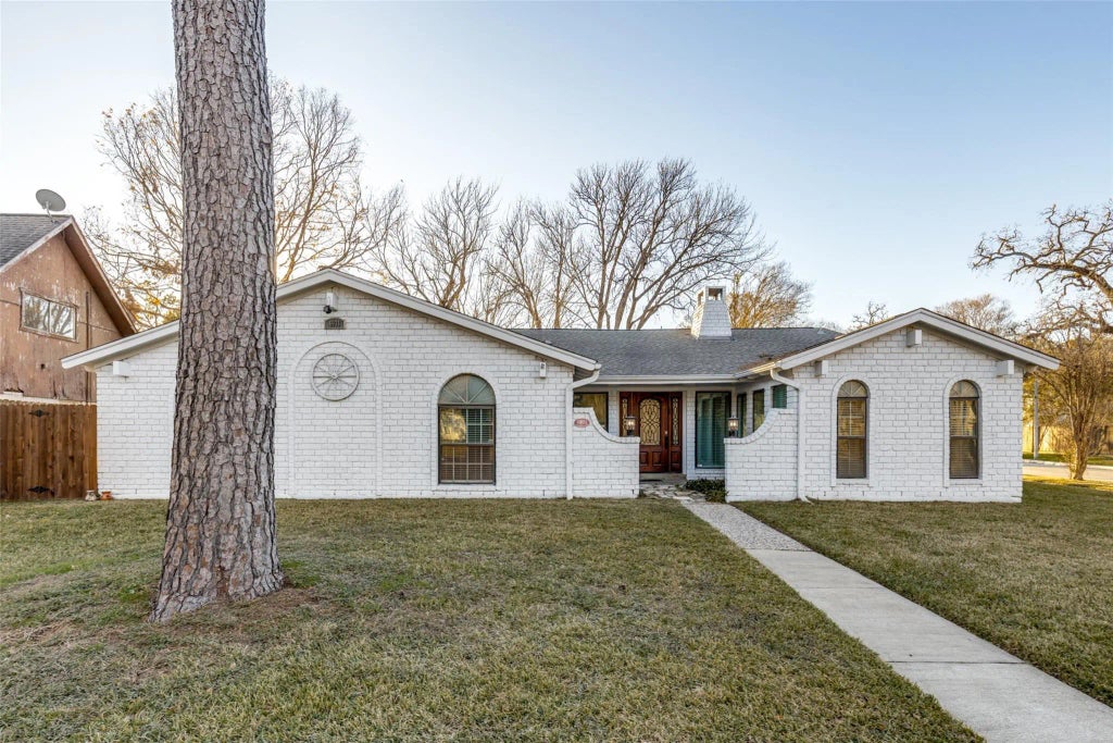 The home boasts a spacious living room with built-in shelving and a brick fireplace, an updated kitchen with white cabinets and granite countertops, and a formal dining area with abundant natural light. The primary bedroom includes a large closet concealed by a sliding barn door, and the bathrooms have been beautifully renovated with ample storage.