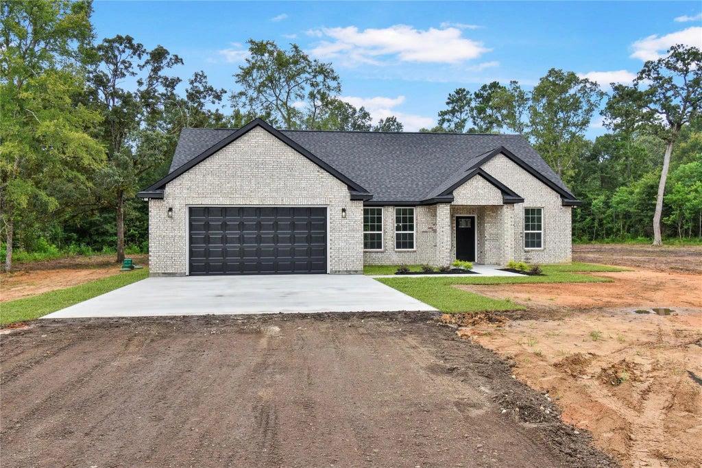 Escape to this serene country site with a brand new all BRICK house on 2.01 acres of cleared land. The 3-bedroom, 2-bathroom home features an open-concept layout, stylish kitchen with quartz countertops, and modern cabinets. Enjoy luxurious all TILE FLOORING in traffic areas, energy-efficient LED lights, and included GE appliances. With city water, a septic system, and no HOA dues, this home offers privacy and peace just under an hour from The Woodlands, and even less to Conroe, and Huntsville. Don't miss out on this charming and functional property perfect for living and entertaining.
