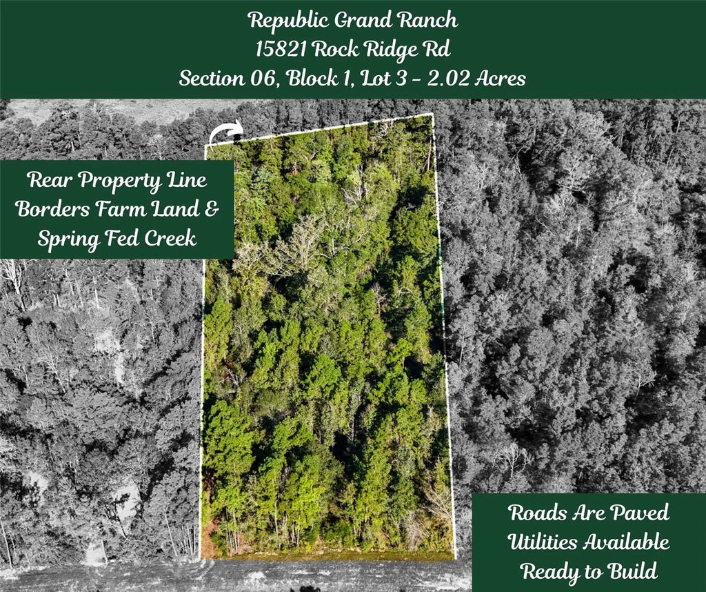 Yearning for privacy, space, & serene country living? Experience the charm of Republic Grand Ranch, a beautiful wooded community nestled along a scenic country road in Montgomery County. This 2-acre property boasts mature trees, a spring-fed creek running along the back of the property neighbored by serene farm land. This expansive area features towering trees, paved roads, water access (community well), high-speed fiber optic internet, and underground power. Residents can enjoy an array of outdoor spaces, including covered pavilions, parks, ponds, playgrounds, & BBQ areas, perfect for gatherings & relaxation. Don't miss the green space to hike, bike, or even go horseback riding! Conveniently situated near shopping & entertainment w/ easy access to I45, this community combines tranquility w/ accessibility. Plus, benefit from low taxes & no MUD tax. Horses & domestic animals are allowed (1 horse/hen per acre). Building restrictions include 2,000+ sq.ft. homes w/ RGR approved Builders.