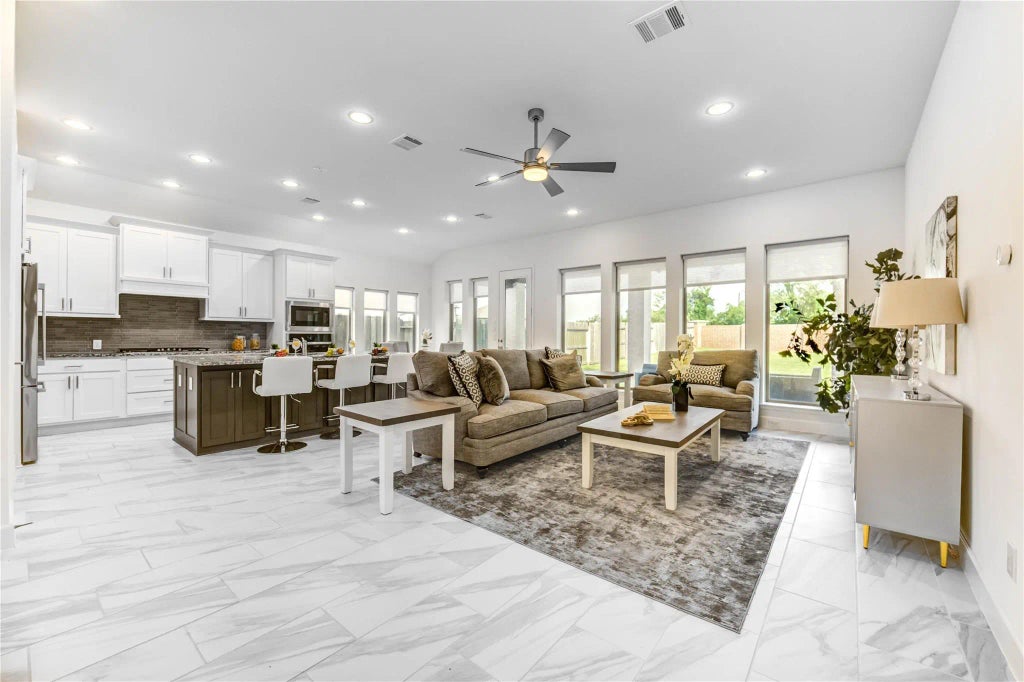 Nestled on an oversized cul-de-sac lot in Sienna’s Valencia neighborhood, this Mediterranean-style Perry Home blends timeless elegance with everyday comfort. A grand 8-foot front door sets the tone for the bright, open interior with tall tray ceilings, 5" baseboards, and 8' six-panel doors. Secondary bedrooms with walk-in closets are tucked at the front of the home, while a glass-enclosed flex room offers the perfect space for a home office, playroom, or cozy retreat. The formal dining room seamlessly transitions into a spacious kitchen featuring stainless steel appliances, a large island, and ample storage. The private primary suite features soaring ceilings and oversized windows, creating a peaceful, light-filled escape. Step outside to a covered patio and expansive backyard—offering plenty of space for a future pool, outdoor fun, and entertaining year-round.