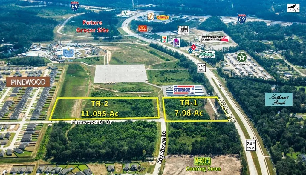 Strategically positioned along high-traffic Hwy 242, this exceptional 19.175-acre property offers outstanding potential for retail, sports, or commercial development. Featuring approximately 465.81 feet of frontage, the tract provides maximum visibility in a high-growth corridor. The property will be divided into two tracts — 7.98 acres and 11.095 acres — allowing flexibility for a variety of development opportunities. Ideally located near major attractions including Big Rivers Water Park and SpeedSportz Raceway, and offering convenient access to Hwy 99 (Grand Pkwy), I-69, Houston, and Bush Intercontinental Airport, this site is perfectly positioned for long-term growth and success. An incredible opportunity in one of the area’s fastest-growing markets!