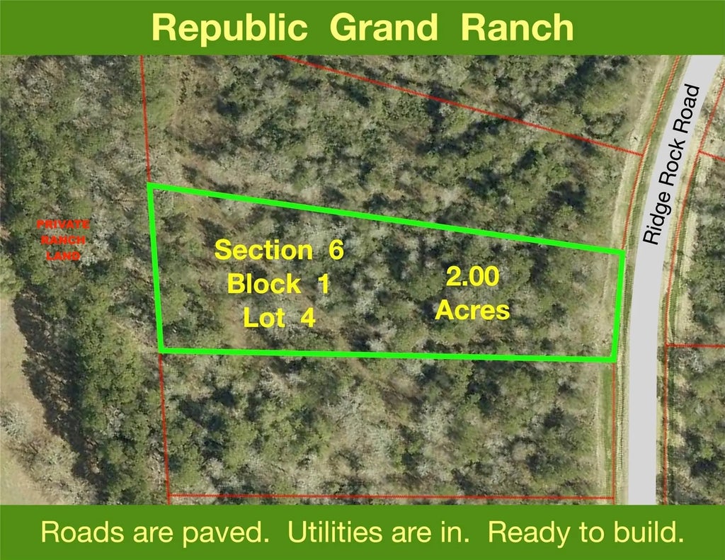 2.00 ACRES > HEAVILY WOODED >BACKS UP TO PRIVATE RANCH > LEVEL TERRAIN > Located on the outskirts of Willis with great schools and nearby shopping. Large lot wooded community with gentle rolling hills. Peaceful privacy. You will never be crowded by neighbors. Republic Grand Ranch is a large lot, wooded community in the rolling hills. Country lifestyle for your custom forever home. Trees, paved roads, water, HIGH SPEED fiber optic internet & underground power through out. Covered pavilions, parks, ponds, playgrounds, BBQ areas. Minutes from shopping, dining, schools, hospitals, and entertainment. Low taxes - No MUD tax. Average elevation is 400’ ASL. Plenty of greenspace and trails for hiking, biking and horseback riding.