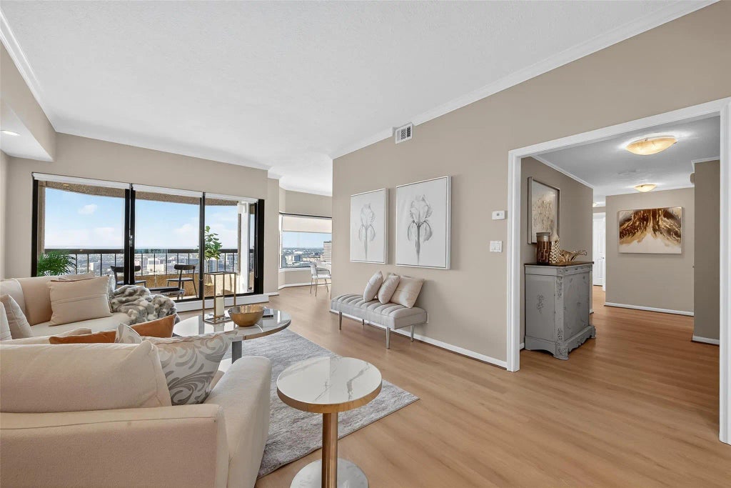 Luxury high-rise living on the 33rd floor near the Houston Medical Center! This 2-bedroom, 2-bath residence offers panoramic city views and abundant natural light. Formal foyer, crown molding, and a bright kitchen with granite countertops, white cabinetry, and stainless-steel appliances. Stacked washer, dryer, refrigerator, new microwave, and new heater are included. The dining area features bay windows. Enjoy updated luxury vinyl flooring and fresh paint throughout. The primary suite features a renovated bath with a spa-style shower and walk-in closet. Secondary bath offers a tub/shower combo. Shades on all windows provide comfort and privacy. A conditioned on-site storage unit is included. Resort-style amenities feature 24/7 concierge and valet, heated pool, 24-hour fitness center, wet & dry saunas, racquetball court, party rooms, outdoor grill cabana, and direct access to Hermann Park trails. Located minutes from Downtown and the Galleria. Virtual tour attached.